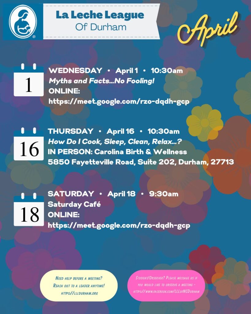 La Leche League of Durham, North Carolina, is starting the month with the Wednesday ONLINE meeting!