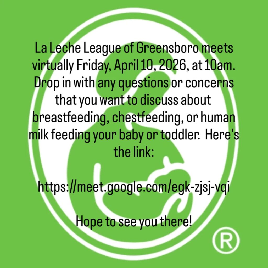 La Leche League of Greensboro is meeting online this Friday, April 10th, at 10am.